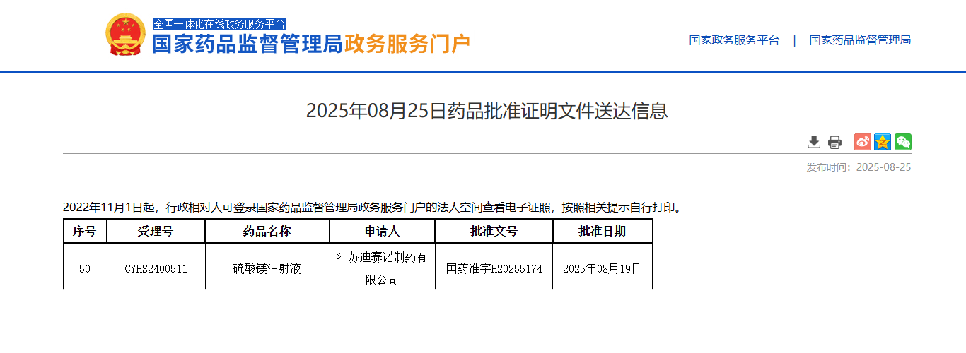 近日,华球官方网站_华球(中国)官方收到国家药品监督管理局签发的硫酸镁注射液获批信息通知,并在国家药品监督管理局政务服务门户平台公示。